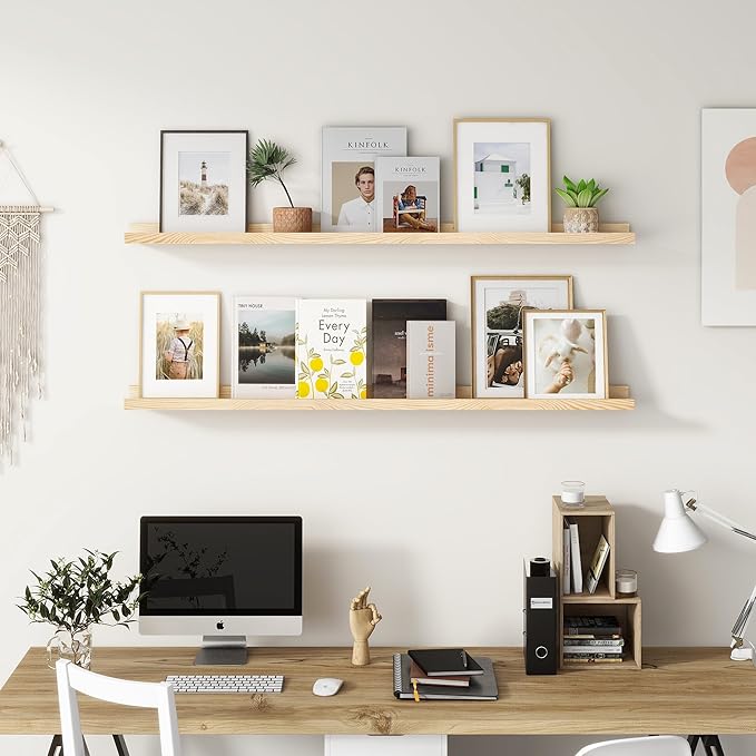 • Easy to Install: You will get a level, screws for the wall, drywall anchors, a detailed installation guide, and two beautiful hand-crafted solid pine wood shelves. With the level, you can make sure your picture ledge shelves are well aligned. Just follow the simple instruction to install the hanging shelves for wall decor within 10 minutes. We add additional screw and anchor to the hardware bag just in case. If you have any questions about our products, please feel free to contact us