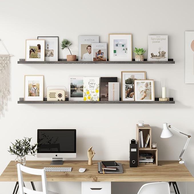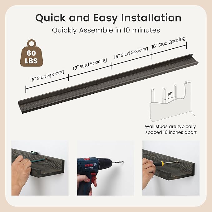 • Easy to Install: You will get a level, screws for the wall, drywall anchors, a detailed installation guide, and two beautiful hand-crafted solid pine wood shelves. With the level, you can make sure your picture ledge shelves are well aligned. Just follow the simple instruction to install the hanging shelves for wall decor within 10 minutes. We add additional screw and anchor to the hardware bag just in case. If you have any questions about our products, please feel free to contact us