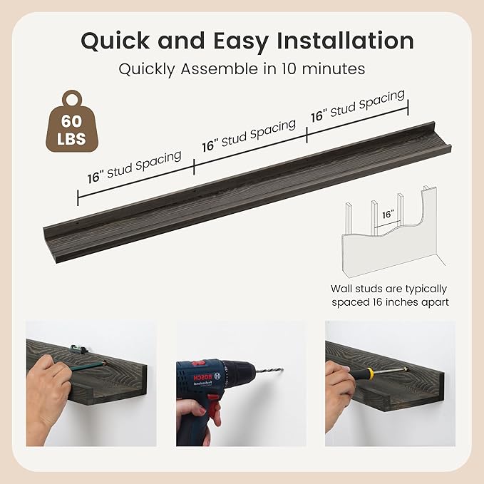 • Easy to Install: You will get a level, screws for the wall, drywall anchors, a detailed installation guide, and two beautiful hand-crafted solid pine wood shelves. With the level, you can make sure your picture ledge shelves are well aligned. Just follow the simple instruction to install the hanging shelves for wall decor within 10 minutes. We add additional screw and anchor to the hardware bag just in case. If you have any questions about our products, please feel free to contact us
