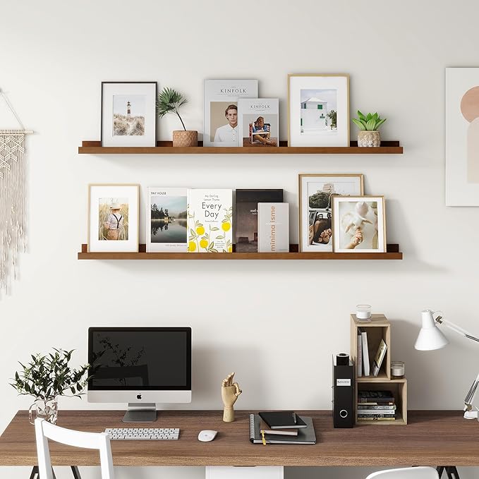• Easy to Install: You will get a level, screws for the wall, drywall anchors, a detailed installation guide, and two beautiful hand-crafted solid pine wood shelves. With the level, you can make sure your picture ledge shelves are well aligned. Just follow the simple instruction to install the hanging shelves for wall decor within 10 minutes. We add additional screw and anchor to the hardware bag just in case. If you have any questions about our products, please feel free to contact us