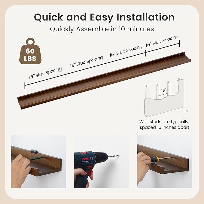 • Easy to Install: You will get a level, screws for the wall, drywall anchors, a detailed installation guide, and two beautiful hand-crafted solid pine wood shelves. With the level, you can make sure your picture ledge shelves are well aligned. Just follow the simple instruction to install the hanging shelves for wall decor within 10 minutes. We add additional screw and anchor to the hardware bag just in case. If you have any questions about our products, please feel free to contact us