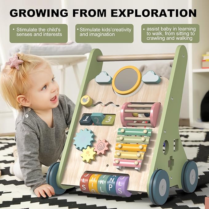 • 🌟【Develops Key Early Skills】Beyond a baby walker toy, this wooden activity walker cultivates creativity and problem-solving. As a push baby walker and pull learning walker, it enhances coordination for ages 6-12 months. The wooden push walker’s multi-sensory features foster cognitive growth – a true montessori walker.