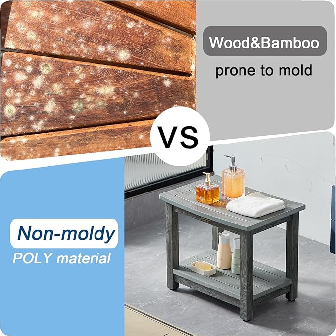 • 【Material & Size】Our gray shower bench is made of polystyrene, it looks like real wood from out look, but actually it's a heavy duty plastic, it's not easy to moldy & rotting after prolonged exposure to humidity, no splinters and no maintenance ( 21.3 x 14 x 17.3 Inches).