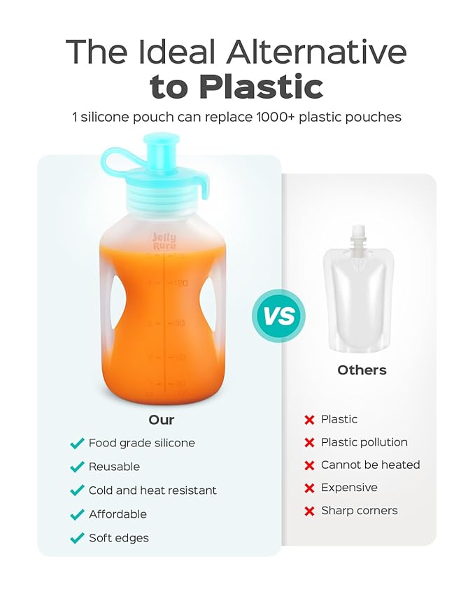 • Durable and Reusable: These refillable baby food pouches are made from high-quality silicone for long-lasting use. Reusable design reduces waste and promotes sustainability