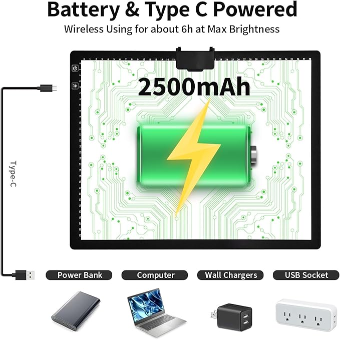 • [USB-C Powered and Battery Powered] The A3 rechargeable LED light pad contains a 2500mAh lithium battery, which can work for about 5 hours after 2 hours of charging, allowing you to enjoy the convenience of using it anytime, anywhere. We use an upgraded Type-C port that is more sturdy and stable to maintain stable charging. Comes with a 6-foot (1.8 m) cable that conveniently plugs into your laptop, power bank, USB adapter, and more. Applicable to both battery mode and charging mode.