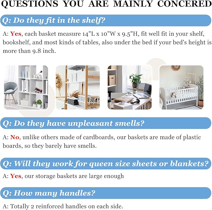 • 【MULTI-PURPOSE】 Our 4 pcs closet storage bins are home essentials to save storage space and keep everything organized. Large enough baskets for organizing clothes, kid’s toys, nursery room items, extra linens, laundry, towels, sheets, pantry and more.