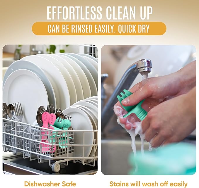 • EFFORTLESS CLEAN-UP: Made of high-quality food-grade silicone material, our baby silicone feeding set is very easy to clean up and will leave no stains. Simply, place the set in the dishwasher and they will come out clean and sanitized. These toddler spoons and forks are also lightweight and easy to hold, making it perfect for on-the-go meals.