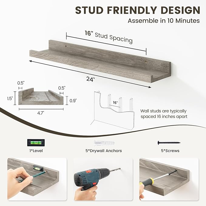 • 【Easy and Quick Installation】Our Picture Ledge Shelves are designed for seamless installation. The package includes all the necessary hardware needed to mount it easily onto any wall space. Just follow the simple instructions provided, and your wall shelves will be ready for use in minutes.