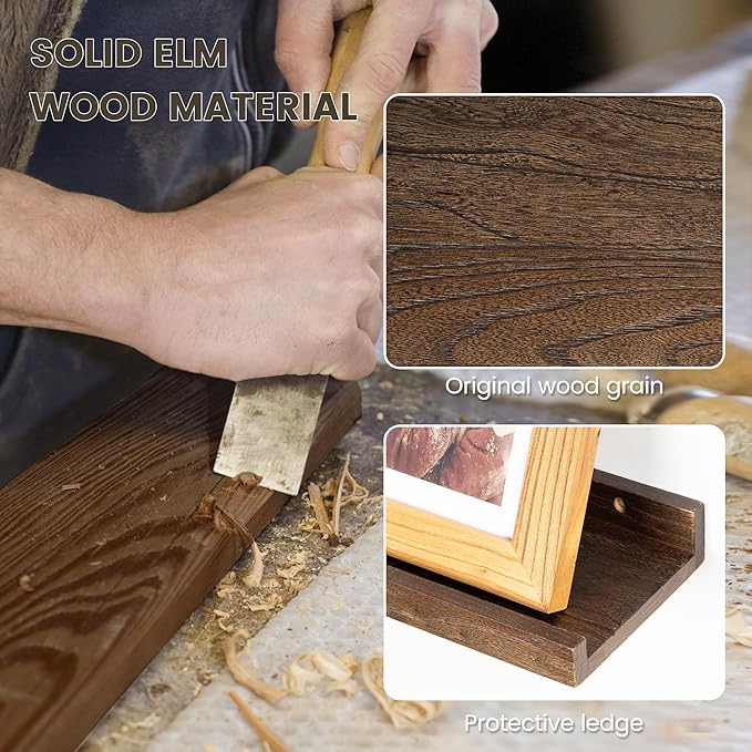 • 【100% Solid Elm Wood Shelves】Our handcrafted wood shelves are made of high-quality reclaimed elm wood, which features distinctive grain patterns and beautiful wood knots, adding a touch of character to your living space. The shelves come in a rustic natural finish that ensures lasting durability while also making each shelf unique.