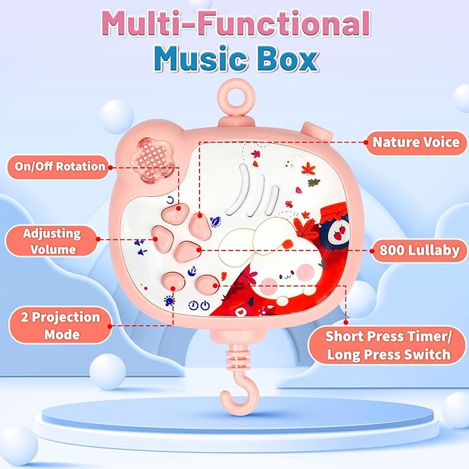 • 【Baby Crib Toys】: Baby Mobile includes a music box with adjustable volume and soft lighting that plays lullabies. With the soft music, the animal rattles slowly rotate to accompany and soothe your baby to a sweet sleep.