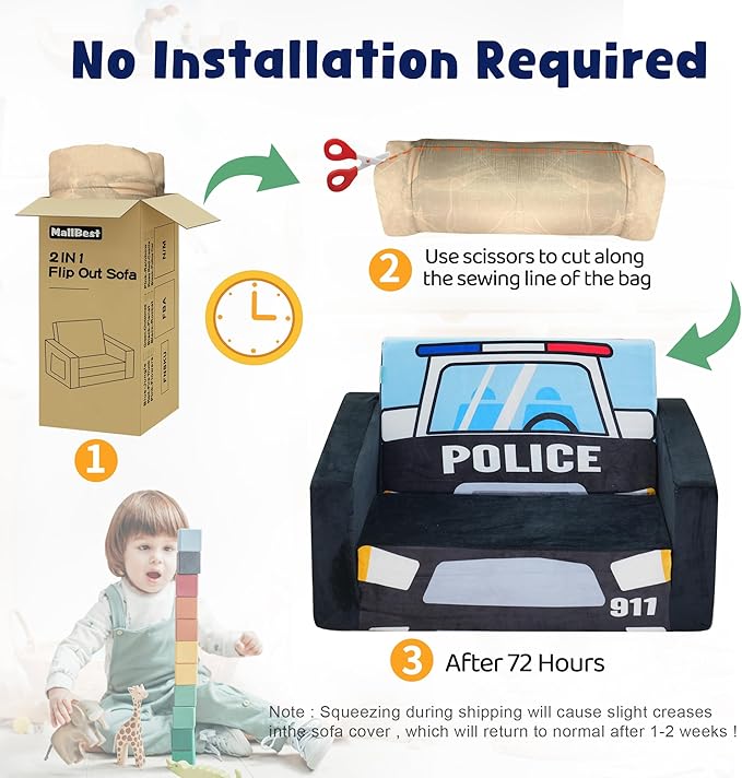 MallBest Kids Sofas Toddler Couch Bed Baby's Upholstered Chair Sleepover Couch Flipout Open Recliner(Black/Police Car)