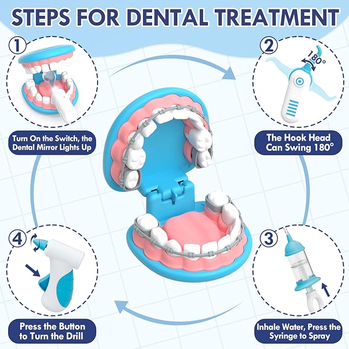 • Innovative & Fun Learning: Our exclusive fake tooth model is tougher and more realistic than others, featuring perfectly fitting braces and clear aligners. This medical kit boosts fine motor skills, creativity, and dental care awareness through hands-on play