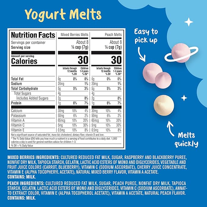• Yogurt Melts Freeze-dried yogurt snack made with real fruit (2) Mixed Berries Naturally flavored with other natural flavors (2) Peach Naturally flavored with other natural flavors