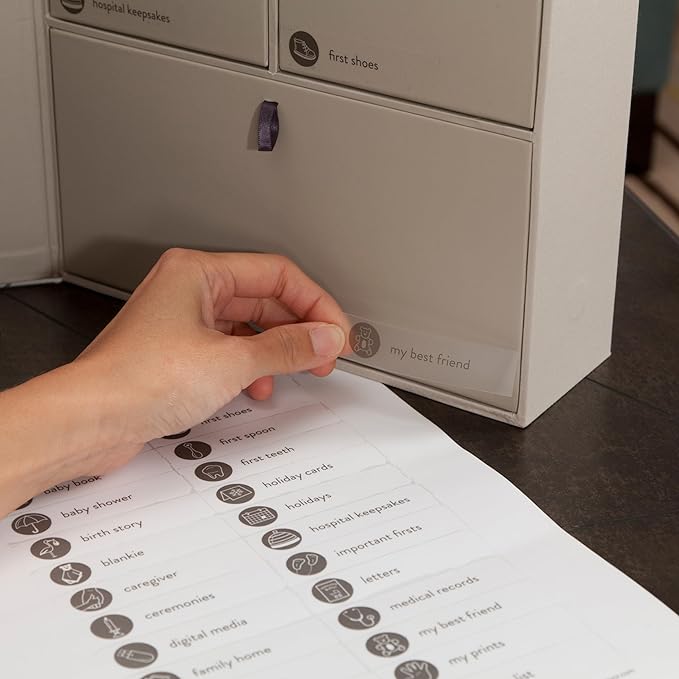 • Bespoke system for custom keepsake storage: Choose from 52 hand-illustrated labels that show what to save and where to find it. Personalize baby’s memory box with included acetate letters or your baby’s photos.