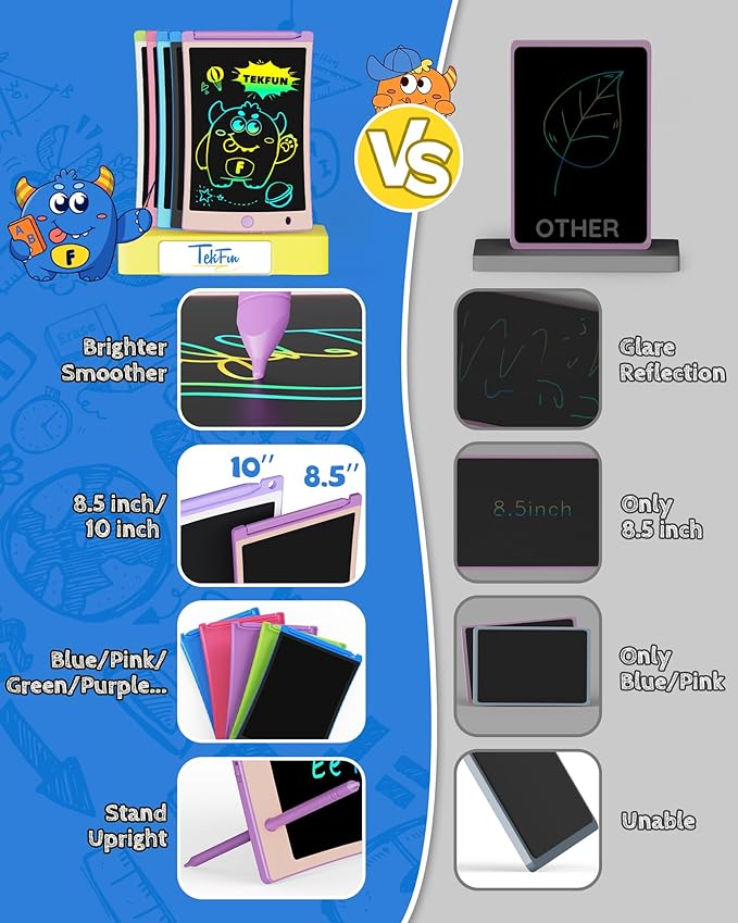 • Eye-Friendly: Say goodbye to blue light and glare with TEKFUN's LCD screen. Your child can draw for hours without straining their eyes, making it a great electronic alternative for preventing visual impairment.