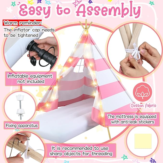 • You Will Receive: 2 kids teepee tents with pink and white stripe, 2 strings of 9.84 feet/ 3 meter star lights, 2 white air beds with a size of 61.81 x 25.98 x 7.09 inches/ 157 x 66 x 18 cm, 2 pieces of white fitted sheets that fit perfectly on the air mattress; Together these will add fun to your child's sleepover party