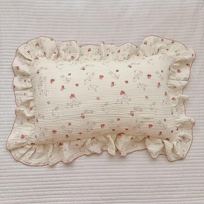 BuLuTu Cute Flower Rabbit Toddler Pillowcase for Girls Boys Soft Breathable Muslin Cotton Kids Pillow Covers, Animal Themed Small Pillow Case for Crib/Toddler Bed, 14"x20", Envelope Closure
