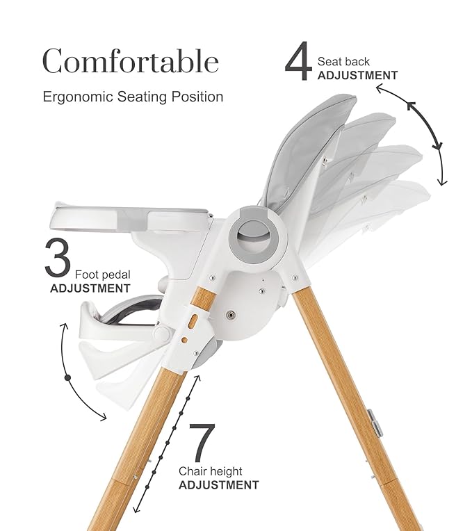 • ADJUSTABLE HEIGHTS, BACKREST & PEDAL: Our high chairs for babies and toddlers has three-level foot adjustment, seven-level seat adjustment and four-level backrest adjustment, adapting to different heights and needs of babies. The use of buttons can be quickly adjusted and converted.