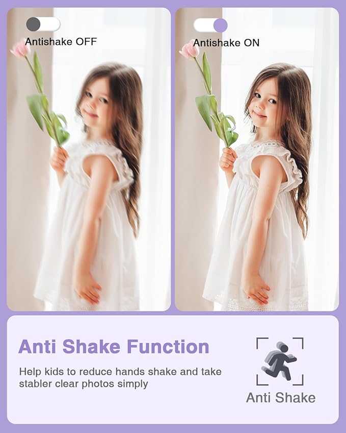 • MEANINGFUL GIFT - This purple digital camera for kids is equipped with a high-level CMOS Sensor and anti-shake function, which helps to capture vivid clear 44MP Images and record stable smooth FHD 1080P resolution videos. It's a meaningful Christmas or birthday gift camera for kids to cultivate their interest in photography, experience the lovely life, and leave funny memorable moments with family or friends.