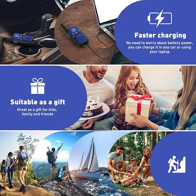 • 【Rechargeable Walkie-Talkies】Powered by 3 AA 1000mah batteries, low battery alert to avoid mid-communication drop-offs and static noise, automatic power-saving to extend battery life and entertainment time. (3x 3 AA 1000mah batteries、3 x Family Walkie Talkies、2 x micro USB charging cable、 3 x new lanyard 、3 x belt clips、1 x User's Manual、1x Exquisite Gift Box).