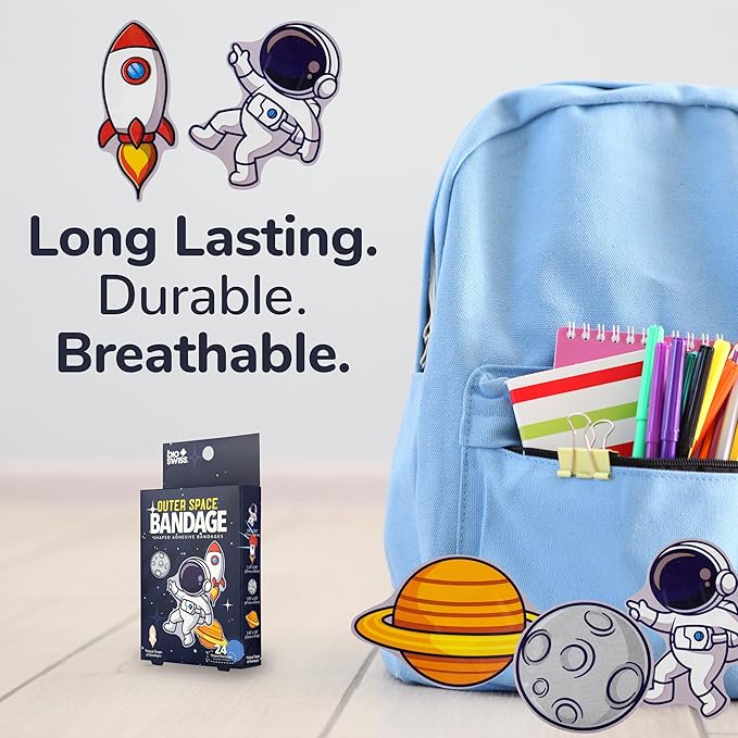 • OUTER SPACE BANDAGES: This 24 piece pack of Outer Space bandages feature fun astronaut, space ship, moon, and planet shapes, and is great for putting a smile on kids' faces while protecting wounds such as cuts, scrapes, and burns; sticky bandages come in a cute cardboard box and are perfect for kids and adults alike, and also for school nurses and pediatric doctors