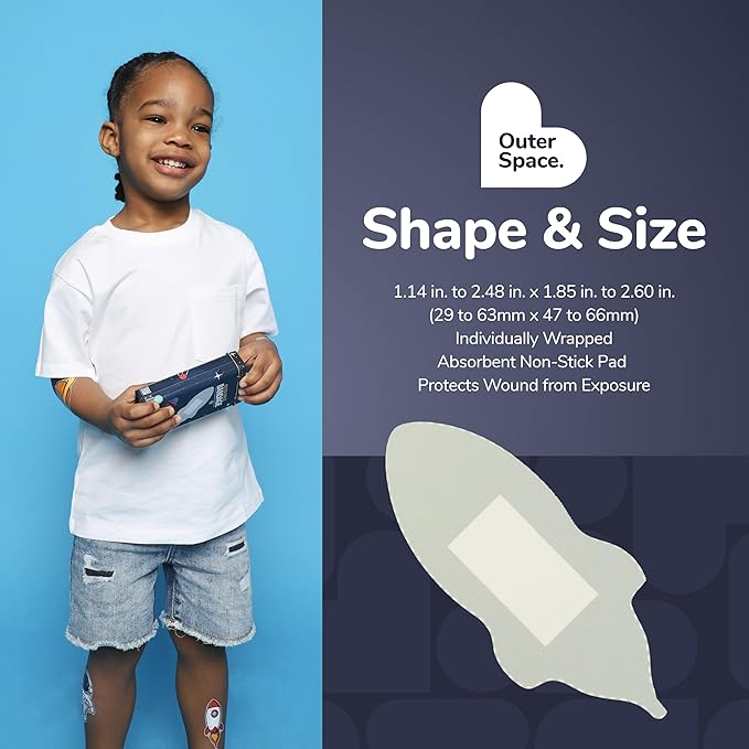 • SAFE PACKAGING: These sterile Outer Space bandages come in cute and adorable packaging, and are individually wrapped for safe handling; small bandages help protect kids' sensitive wounds from coming into contact with dirt for first aid wound care