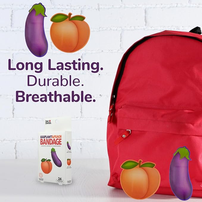 • EGGPLANT AND PEACH BANDAGES: This 24 piece pack of Eggplant and Peach bandages feature fun Eggplant and Peach shapes, and is sure to induce laughter and smiles while protecting wounds such as cuts, scrapes, and burns; sticky bandages come in a cute decorative cardboard box which makes for an excellent novelty gag gift or stocking stuffer for adults