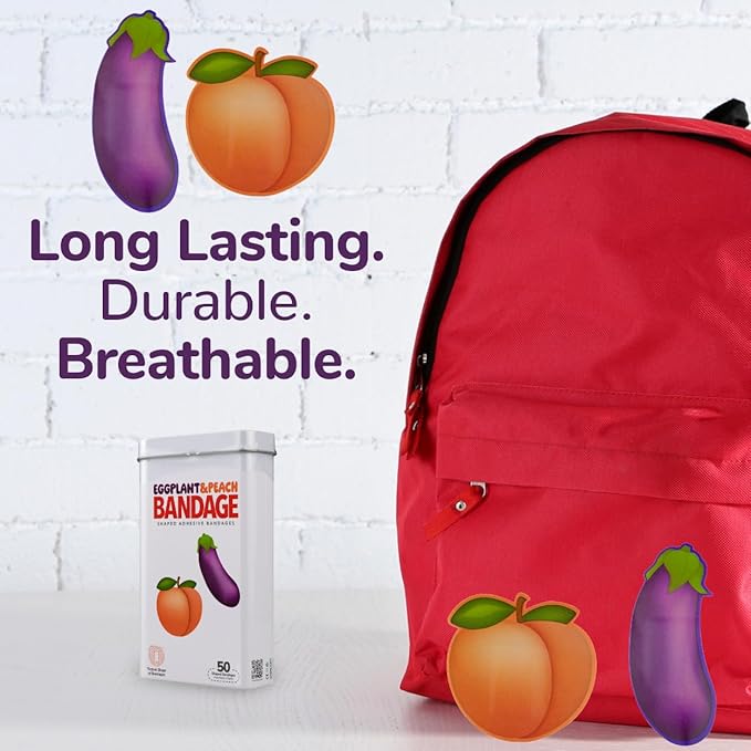 • EGGPLANT AND PEACH BANDAGES: This 50 piece tin container of Eggplant and Peach bandages feature fun Eggplant and Peach shapes, and is sure to induce laughter and smiles while protecting wounds such as cuts, scrapes, and burns; sticky bandages come in a cute decorative cardboard box which makes for an excellent novelty gag gift or stocking stuffer for adults