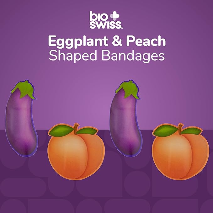 BioSwiss Bandages, Eggplant and Peach Shaped Adult Self Adhesive Bandage, Latex Free Sterile Wound Care, Funny First Aid Kit Supplies for Adults, 50 Count