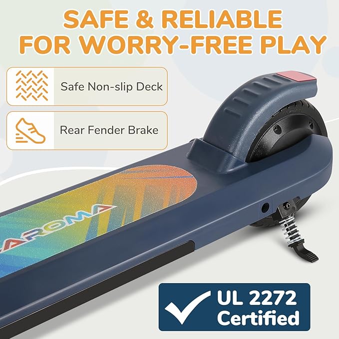 • ๐ŸŒŸEnjoy safe riding:The kids electric scooter adopts a start-up assist design tailored for children. The motor will not start until the riding speed reaches 2mph/h, thus avoiding the accidental start of the scooter. The dual function design of the rear wheel is both a fender and a foot brake for easy and quick deceleration. The electric scooter for kids also comes with non-slip pedals and handles to provide your child with a convenient, safe, stable and enjoyable ride.