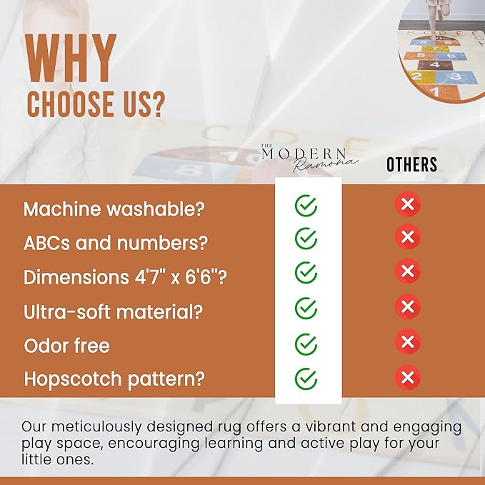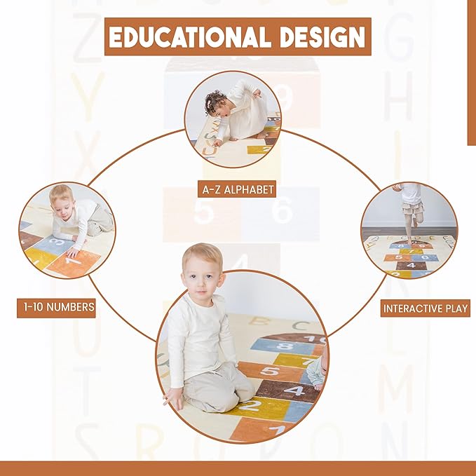 • ๐‘๐ฎ๐  ๐Ÿ๐จ๐ซ ๐…๐ฎ๐ง & ๐‹๐ž๐š๐ซ๐ง๐ข๐ง๐ : All you need are some good neutral modern colors, hopscotch, and the alphabet, and you have the perfect toddler rug for your toddler room decor. One standout childhood memory of mine is playing hopscotch, and you better believe I was going to pass that experience down to my kids. Now adding the alphabet into the mix has increased the number of games and activities we can come up with using this play mat. This versatile Kids rug for playroom enhances your toddlers playroom decor while providing a playful and educational environment.