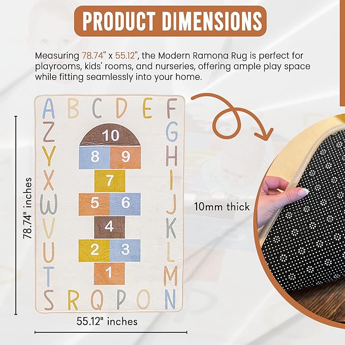 • ๐๐ž๐ซ๐Ÿ๐ž๐œ๐ญ ๐๐ฅ๐š๐ฒ ๐’๐ฉ๐š๐œ๐ž: The gorgeous kids play rug measures 4'7" x 6'6" and is 10mm thick. For those who prefer metric measurements, it converts to 140 x 200 cm or 55.12 x 78.74 inches. Kids room hopscotch rug provide ample space for play and activities, making it a perfect addition to any child's room or play area. The abc rug for kids playroom comes in a generous size and cozy thickness, accommodating various activities and ensuring comfort for your little ones.