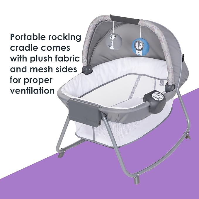 • Includes removable and spacious portable cradle with rocking and stationary modes; Portable rocking cradle comes with canopy and carry handle, plush fabric and mesh sides for proper ventilation, and two plush hanging toys to encourage grasping and reaching