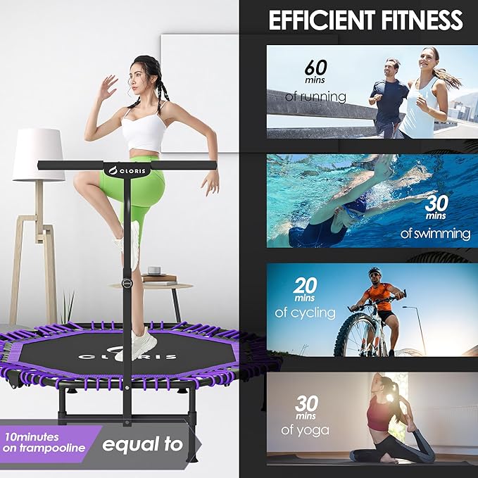 • 【SAFE AND FUN】 The padded handlebar is adjustable from 32.6” to 40.5” which fits your kid’s height perfectly. Kids can use the handlebar for easy grip to control their bounce. This springless trampoline is safer than the spring rebounders, primarily due to more soft parts. There is less of a chance of experiencing pinched fingers or toes, regardless of the safety precautions in place. Moreover, this trampoline has been added with a covering on top of the bands to provide safer jump pad surface