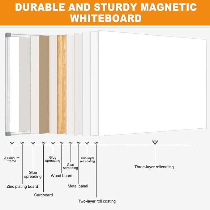 • PREMIUM MAGNETIC DRY ERASE BOARD: Crafted with a specially lacquered surface for a smooth and durable writing experience, our magnetic dry erase board boasts high-quality construction. The robust silver aluminum frame is scratch-resistant, and the ABS plastic corners with secure screw-fixing ensure safety and long-lasting durability. The detachable marker tray keeps writing essentials within reach, emphasizing convenience and safety without any sharp edges.