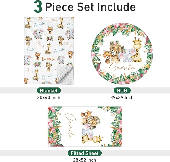 Personalized Baby Crib Bedding Set - Custom Name Lions Design 3 Pcs Set - Soft Blanket with Double Layer Dotted Backing, Fitted Sheet, Room Rug for Newborns Boys Girls Shower Gift