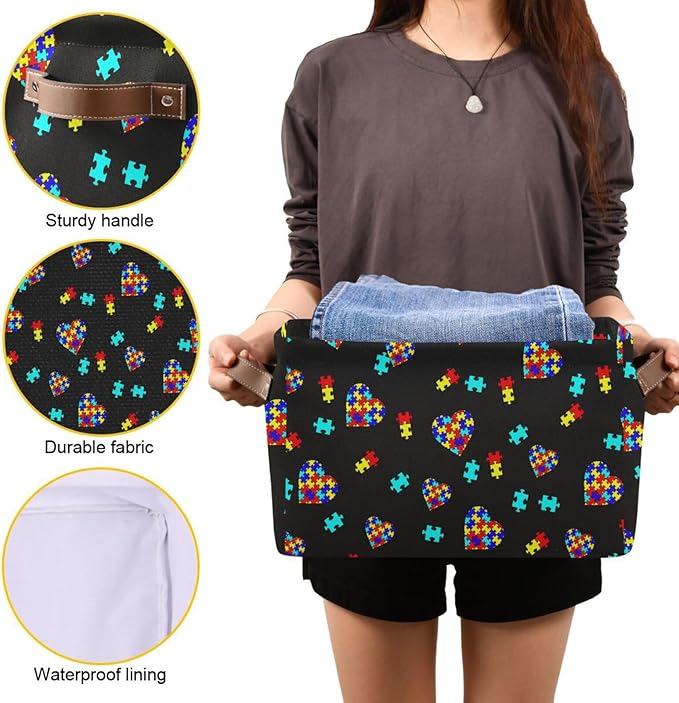 Multicolor Storage Basket Bin Autism Awareness Puzzle Pieces Heart Organizer Collapsible Shelf Cube with Handle for Nursery Bedroom Bathroom