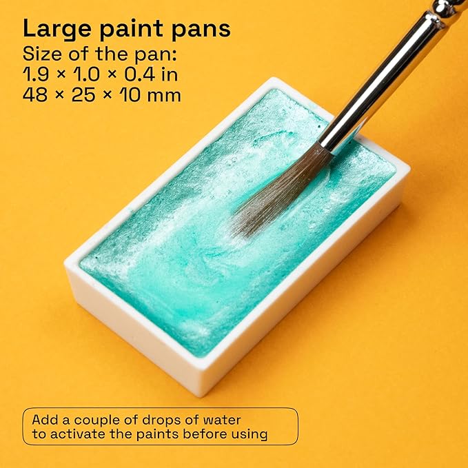 • Travel-Friendly Design: Designed for artists on the go, this travel metallic watercolor paint set is compact yet comprehensive, making it easy to create art anywhere. The sturdy case protects the metallic paints and includes a removable palette for convenience.