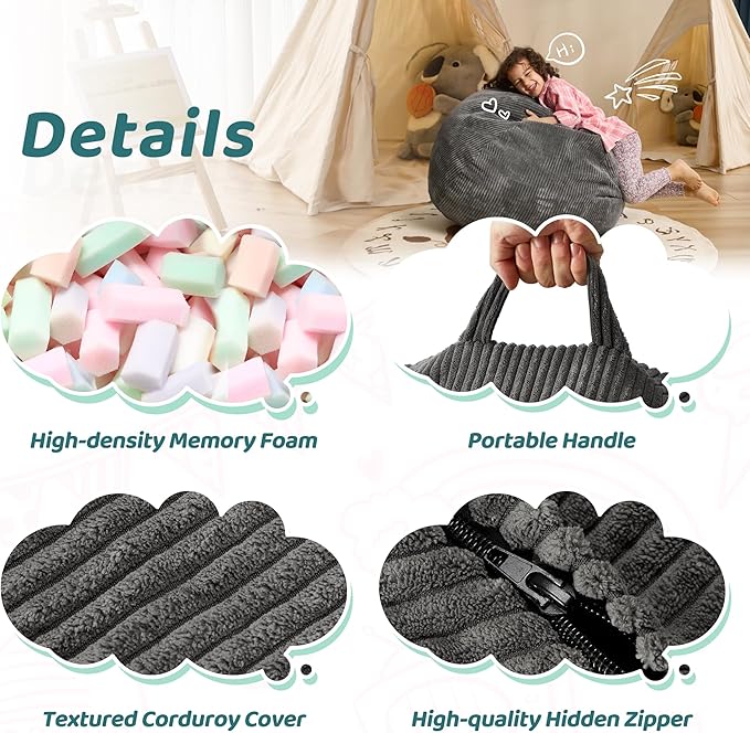 • COMFORTABLE & DURABLE FABRIC: Our bean bag chair is made of textured corduroy, which is skin-friendly. The cover can be machine washable so that you can clean it like new. The filled memory foam is high-density, which is easily rebound and make you feel relaxed once you lie down or sit on the chair.