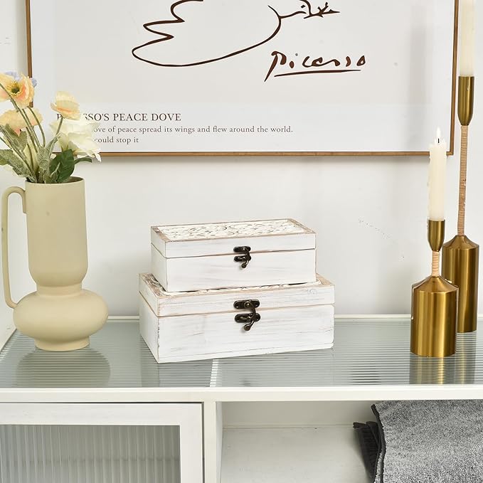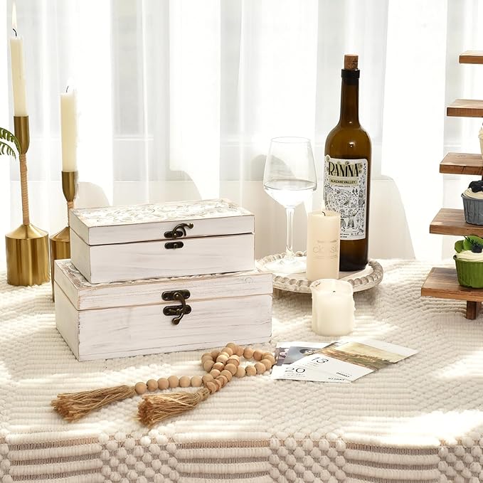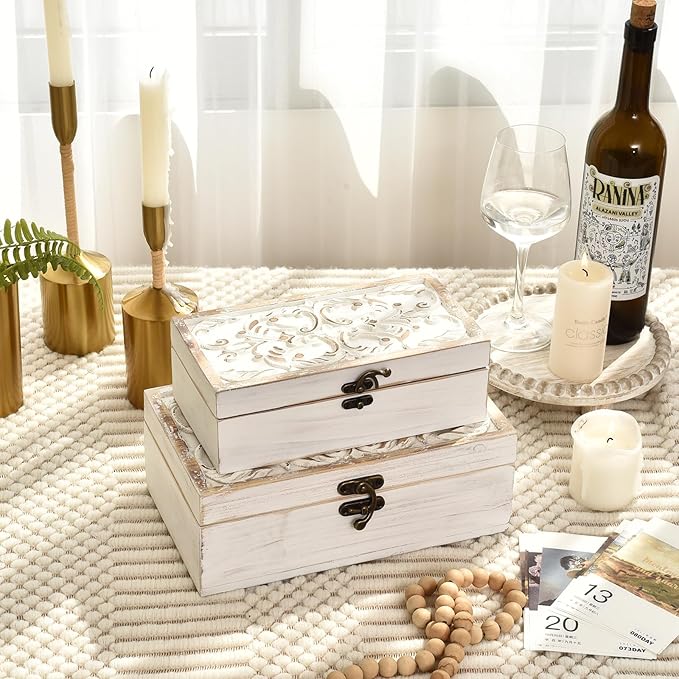 • Rustic Farmhouse Charm: Embrace the rustic elegance of these decorative boxes, designed to evoke a sense of nostalgia and tranquility. The hand-carved motifs on the lids beautifully capture the essence of farmhouse aesthetics, while the distressed white wash finish adds a vintage touch. Every glance at these boxes will transport you to the idyllic countryside, creating an ambiance of warmth and charm in your home.