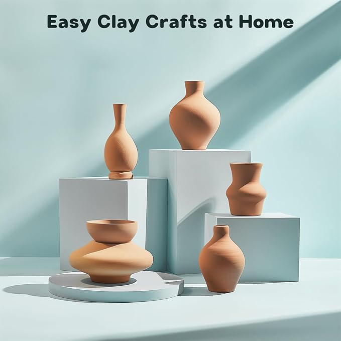 • Complete Pottery Kit: This kit includes a pottery wheel, power adapter, 8 sculpting tools, 2 paint brushes, 3 packs of air-dry clay, and 12 vibrant paints. Ideal for beginners and kids starting their pottery adventure