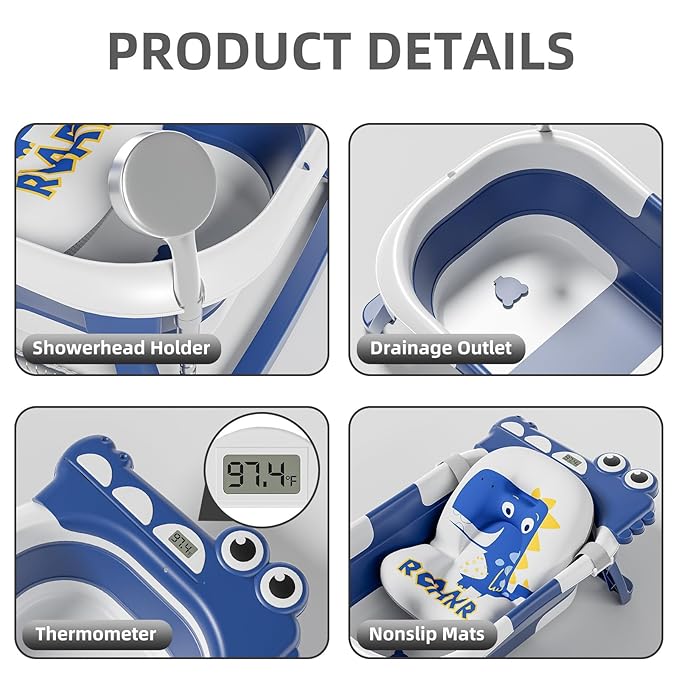 • Visible Real-time Temperature Monitoring: The travel-friendly baby bathtub is equipped with a real-time temperature sensor, offering instant reminders to prevent scalding or exposure to cold water. The wrap-around temperature lock system ensures accurate monitoring, making it a versatile choice for use in bathrooms, homes, during travel, or camping.