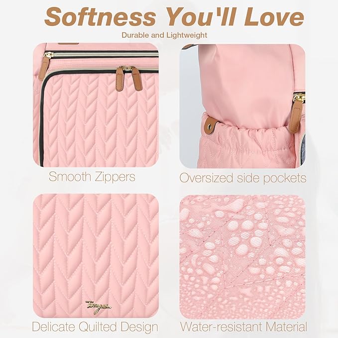 • Quilted Materials:Tonyeee diaper bag with 3D herringbone nylon quilting,achieve a perfect blend of practicality and fashion. While studded feet in the bottom keep the bag clean and off the ground