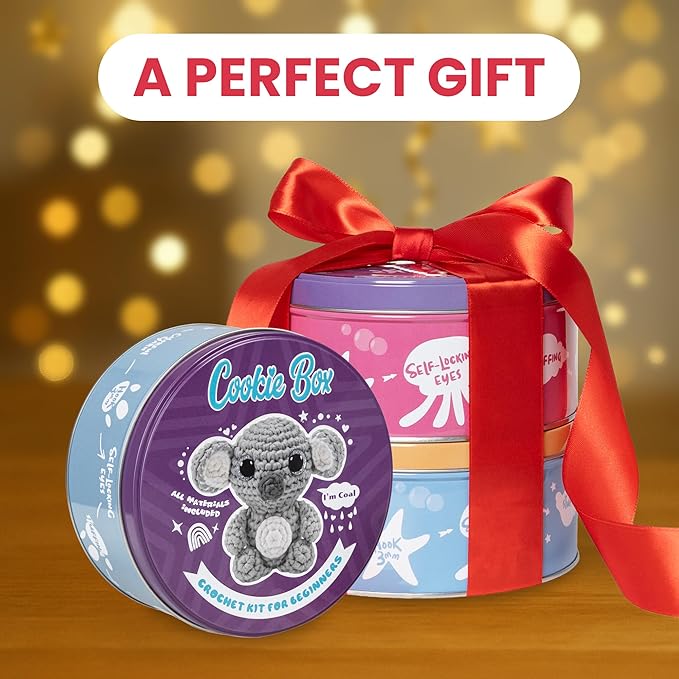 Cookie Box Crochet Kit for Beginners - Learn to Craft Amigurumi Stuffed Animals - Knitting Gift for Kids and Adults - Beginner-Friendly Yarn - Stitch-by-Stitch Video Tutorial - Koala Coal