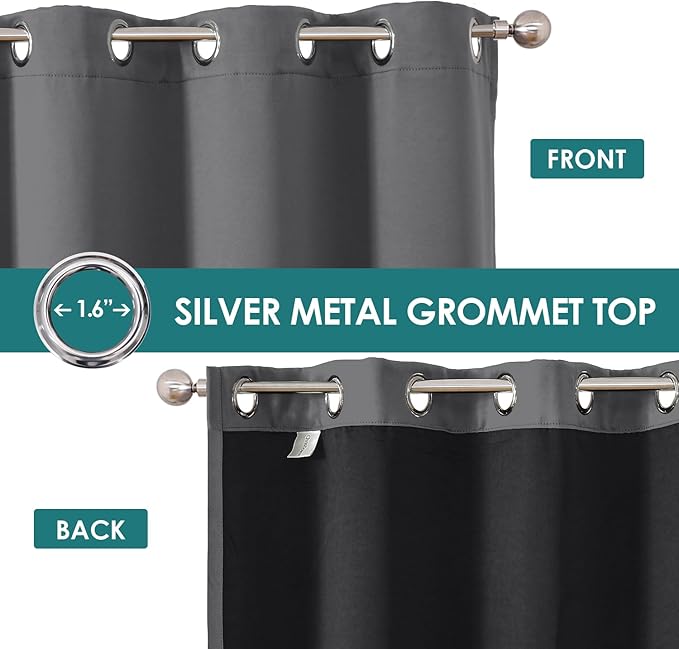 • SET DETAILS: Set of 2 gray total blackout curtain panels per package. Each lined curtain measures 52 inch wide by 80 inch long with 8 silver metal grommets (1.6 inch inner diameter) on top, easy to install and slide.