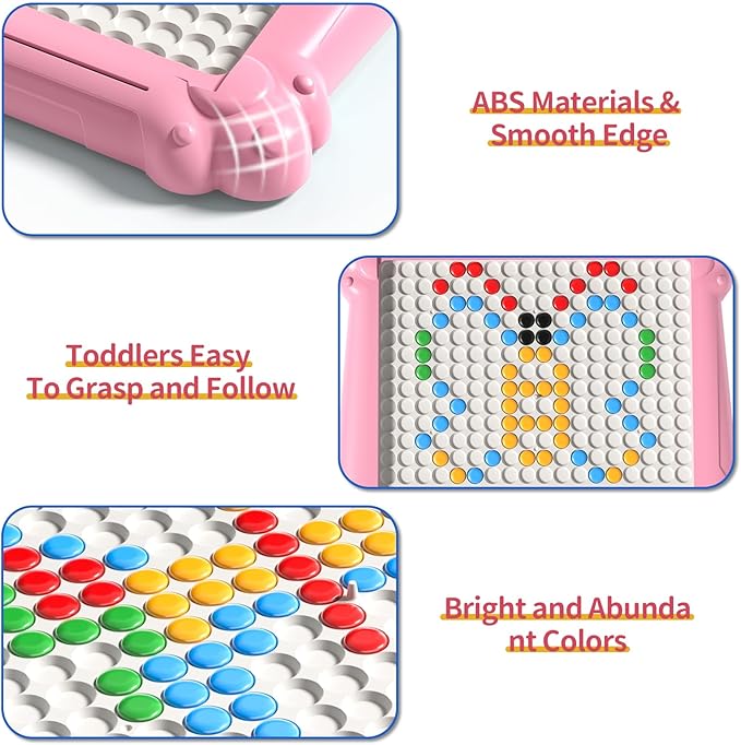 • 【Well Designed Non-toxic】Magnetic drawing board is made of kids friendly ABS plastic material. The rounded corners of the magnetic dots board are smooth to take care of little ones' small hands. All magnetic beans are sealed inside a clear acrylic panel which can effectively avoid the risk of toddlers swallowing. The magnetic pen has just the right magnetic force to pick up 1 magnetic bead, avoiding the situation where the bead cannot be moved or 2 beads are picked up at the same time.