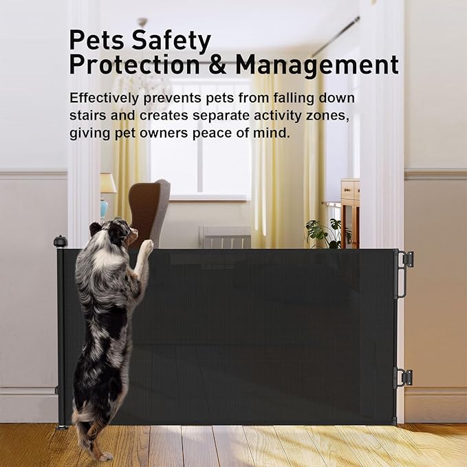• New Safety Locking: The knob at the top of the mesh gate ensures that the retractable pet gate is easy to use for adults and can be opened and closed with one hand, while curious babies and pets will not be able to make any naughty bids for freedom. For best performance, remember to lock the latch after installation to fully tighten the mesh and ensure stability.