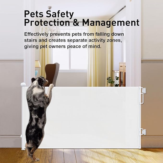 • New Safety Locking: The knob at the top of the mesh gate ensures that the retractable pet gate is easy to use for adults and can be opened and closed with one hand, while curious babies and pets will not be able to make any naughty bids for freedom. For best performance, remember to lock the latch after installation to fully tighten the mesh and ensure stability.