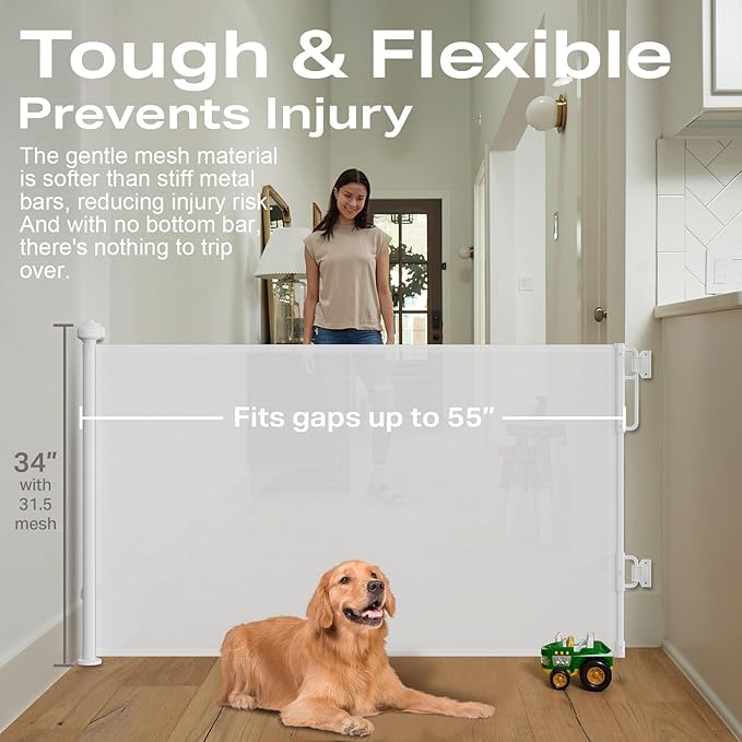 • Expandable Size: Our Retractable Baby Gate extends up to 55" wide and is 34" tall.The Cumbor mesh dog gate conveniently rolls up when not in use, making it easy to convert the room into an adult-friendly space again