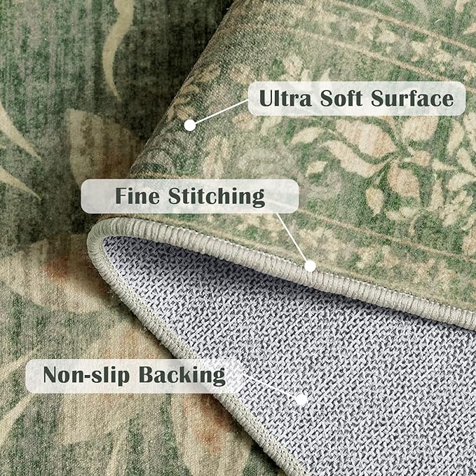 jinchan Floral 6x9 Green Area Rugs for Living Room - Machine Washable Vintage Distressed Design Soft Throw Rug Non-Slip Large Carpet for Bedroom Dining Room Home Office Nursery (6x9ft,Dark Green)